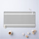 This modern, bold design features two slender horizontal white stripes near the top and bottom edges of the design against a light grey background.