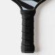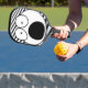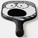 Pickleball paddles with image of vector faces against a black and white stripped background.