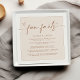 Add a playful touch to your special day with our 'Fun Facts' wedding napkins, customised with charming anecdotes from your unique love story. Crafted with elegance and minimalism, this set features a modern non-serif font and hand-lettered 'fun facts'. It's more than just a napkin - a conversation starter, a smile-sparker, a keepsake. Picture your guests unfolding them to reveal delightful snippets of your journey together - how you met, your shared hobbies, funny memories, and traditions. Ideal for couples who embrace fun and want to infuse their celebration with personal touches, these napkins bring the stories that define you to every table at your wedding."