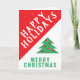 Fun festive red and green Christmas tree holiday Christmas greeting card. Fun Christmas card with Happy holidays and Merry Christmas typography. Festive colors in green, red and white and a simple Christmas tree and snowflakes.