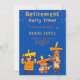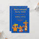 A fun Fiesta Retirement Party Invitation to celebrate someone special on their Retirement, designed with Mariachi band caricatures playing their instruments, dressed in vibrant orange and yellow on a blue background. The front text includes: Retirement Party Time!, Join Us As We Honor, The First and Last Name, The Date and Time, The Location and Address. The reverse text includes: Reply and your Contact Details. To personalize, simply insert your event details into our easy template, replacing the sample text. This invitation is available in both Print and Download.