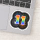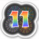 This fun, vibrant sticker design features a colourful bursting celebratory fireworks inspired pattern, along with the number "11" featuring a multicolored rainbow inspired spectrum or gradient pattern. A sticker like this might perhaps be used when celebrating somebody’s eleventh birthday, or perhaps a couple’s eleventh wedding anniversary, or some other 11th event. [~Z0000362]