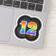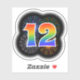 This fun, exciting sticker design features a colourful bursting celebratory fireworks inspired pattern, along with the number "12" featuring a multicolored rainbow like spectrum or gradient pattern. An exciting sticker like this might be fun to use when celebrating somebody’s twelfth birthday, or perhaps a couple’s twelfth wedding anniversary, or some other 12th event. [~Z0000362]