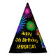 This fun, vibrant birthday party hat design features a colourful pattern inspired by bursting celebratory fireworks, along with the number "13" having a multicolored rainbow inspired spectrum or gradient pattern. It also features a personalised name and event message, such as a "Happy Birthday" birthday greeting. A birthday-themed paper hat like this might be worn by the attendees at a birthday party being held to celebrate somebody’s thirteenth birthday. [~Z0000333]