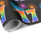 This fun, vibrant wrapping paper design features a colourful celebratory fireworks inspired pattern, along with the number "17" having a multicolored rainbow inspired gradient pattern, on a black coloured background. Wrapping paper like this might be used when wrapping gifts or presents being given for somebody’s seventeenth birthday, or perhaps for a couple’s seventeenth wedding anniversary, or some other 17th event. [~Z0000322]