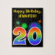 This fun, vibrant puzzle design features a colourful pattern inspired by celebratory fireworks, along with the number "20" featuring a multicolored rainbow like gradient pattern, on a black coloured background. It also features a personalised name and event message, such as a birthday greeting. A puzzle like this might be a fun way to send a birthday message to celebrate somebody’s twentieth birthday. [~Z0000329]