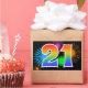 This fun, vibrant sticker design features a colourful pattern inspired by celebratory fireworks, along with the number "21" having a multicolored rainbow like gradient pattern, on a black coloured background. Stickers like this could perhaps be given as a small gift while celebrating somebody’s twenty first birthday, or perhaps for a couple’s twenty first wedding anniversary, or some other 21st event. [~Z0000324]
