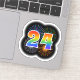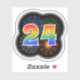 This fun, vibrant sticker design features a colourful pattern inspired by bursting celebratory fireworks, along with the number "24" having a multicolored rainbow like spectrum or gradient pattern. A fun sticker like this might perhaps be used when celebrating somebody’s twenty fourth birthday, or perhaps a couple’s twenty fourth wedding anniversary, or some other 24th event. [~Z0000362]