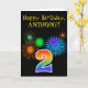 The front of this fun, vibrant birthday greeting card design features a colourful pattern inspired by celebratory fireworks, along with the number "2" having a multicolored rainbow like gradient pattern, on a black coloured background. The front also features a birthday greeting message, including a customised recipient name. The inside features a customisable birthday greeting message, or could perhaps be cleared and left blank if a message is to be written by hand instead. A birthday card like this might be a fun way to send birthday wishes to somebody who is celebrating their second birthday. [~Z0000330]