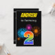 This fun, vibrant birthday party invitation design features a colourful celebratory fireworks inspired pattern, along with the number "2" featuring a multicolored rainbow inspired gradient pattern, on a black coloured background. The name on the front name can be personalised. The back features custom information about the birthday party. Birthday party invitations like this might be used when inviting people to a party celebrating somebody’s 2nd birthday. [~Z0000325]