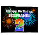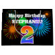 This fun, vibrant gift bag design features a colourful pattern inspired by celebratory fireworks, along with the number "2" having a multicolored rainbow inspired gradient pattern, on a black coloured background. It also features a custom name and event message, such as a birthday greeting. A gift bag like this might be used to wrap a present or gift being given in celebration of somebody’s second birthday. [~Z0000328]
