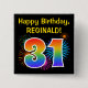 This fun, vibrant button design features a colourful bursting celebratory fireworks inspired pattern, along with the number "31" having a multicolored rainbow like spectrum or gradient pattern. It also features a custom name and event message, such as a "Happy Birthday" birthday greeting. A button like this might be worn by the attendees at a birthday party being held to celebrate somebody’s thirty first birthday. [~Z0000334]