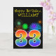 The front of this fun, vibrant birthday greeting card design features a colourful pattern inspired by celebratory fireworks, along with the number "33" featuring a multicolored rainbow inspired gradient pattern, on a black coloured background. The front also features a birthday greeting message, including a customised recipient name. The inside features a custom birthday greeting message, or could perhaps be cleared and left blank if a message is to be written by hand instead. A customisable birthday card like this might be a fun way to acknowledge somebody’s thirty third birthday. [~Z0000330]