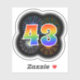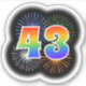 This fun, exciting sticker design features a colourful pattern inspired by bursting celebratory fireworks, along with the number "43" featuring a multicolored rainbow like spectrum or gradient pattern. A sticker like this might perhaps be used when celebrating somebody’s forty third birthday, or perhaps a couple’s forty third wedding anniversary, or some other 43rd event. [~Z0000362]