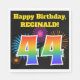 This fun, vibrant paper napkin design features a colourful celebratory fireworks inspired pattern, along with the number "44" having a multicolored rainbow like gradient pattern, on a black coloured background. It also features a customisable name and event message. Paper napkins like this could perhaps be used at a birthday party being held to celebrate somebody’s forty fourth birthday. [~Z0000326]
