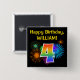 This fun, vibrant button design features a colourful pattern inspired by bursting celebratory fireworks, along with the number "4" having a multicolored rainbow inspired spectrum or gradient pattern. It also features a personalised name and event message, such as a "Happy Birthday" birthday greeting. A button like this might be worn by the attendees at a birthday party being held to celebrate somebody’s fourth birthday. [~Z0000334]