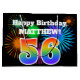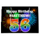 This fun, vibrant gift bag design features a colourful pattern inspired by celebratory fireworks, along with the number "56" featuring a multicolored rainbow like gradient pattern, on a black coloured background. It also features a personalised name and event message, such as a birthday greeting. A gift bag like this might be used to wrap a present or gift being given in celebration of somebody’s fifty sixth birthday. [~Z0000328]