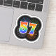 This fun, vibrant sticker design features a colourful bursting celebratory fireworks inspired pattern, along with the number "57" featuring a multicolored rainbow like spectrum or gradient pattern. A sticker like this might be fun to use when celebrating somebody’s fifty seventh birthday, or perhaps a couple’s fifty seventh wedding anniversary, or some other 57th event. [~Z0000362]