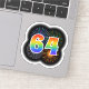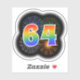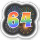 This fun, exciting sticker design features a colourful pattern inspired by bursting celebratory fireworks, along with the number "64" having a multicolored rainbow inspired spectrum or gradient pattern. A sticker like this might be fun to use when celebrating somebody’s sixty fourth birthday, or perhaps a couple’s sixty fourth wedding anniversary, or some other 64th event. [~Z0000362]