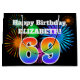 This fun, vibrant gift bag design features a colourful celebratory fireworks inspired pattern, along with the number "69" featuring a multicolored rainbow like gradient pattern, on a black coloured background. It also features a personalised name and event message, such as a birthday greeting. A colourful gift bag like this might be used when wrapping a gift or present that is being given in celebration of somebody’s sixty ninth birthday. [~Z0000328]