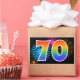 This fun, vibrant sticker design features a colourful pattern inspired by celebratory fireworks, along with the number "70" having a multicolored rainbow like gradient pattern, on a black coloured background. Stickers like this might be given as a small gift while celebrating somebody’s seventieth birthday, or perhaps for a couple’s seventieth wedding anniversary, or some other 70th event. [~Z0000324]