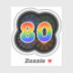 This fun, vibrant sticker design features a colourful pattern inspired by bursting celebratory fireworks, along with the number "80" featuring a multicolored rainbow like spectrum or gradient pattern. A sticker like this might be used when celebrating somebody’s eightieth birthday, or perhaps a couple’s eightieth wedding anniversary, or some other 80th event. [~Z0000362]