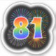 This fun, exciting sticker design features a colourful bursting celebratory fireworks inspired pattern, along with the number "81" featuring a multicolored rainbow like spectrum or gradient pattern. An exciting sticker like this might be used when celebrating somebody’s eighty first birthday, or perhaps a couple’s eighty first wedding anniversary, or some other 81st event. [~Z0000362]