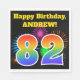 This fun, vibrant paper napkin design features a colourful celebratory fireworks inspired pattern, along with the number "82" featuring a multicolored rainbow like gradient pattern, on a black coloured background. It also features a customisable name and event message. Paper napkins like this could perhaps be used at a birthday party being held to celebrate somebody’s eighty second birthday. [~Z0000326]