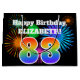 This fun, vibrant gift bag design features a colourful celebratory fireworks inspired pattern, along with the number "83" having a multicolored rainbow like gradient pattern, on a black coloured background. It also features a personalised name and event message, such as a birthday greeting. A fun gift bag like this could be used when wrapping a present or gift being given in celebration of somebody’s eighty third birthday. [~Z0000328]