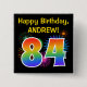 This fun, vibrant button design features a colourful bursting celebratory fireworks inspired pattern, along with the number "84" having a multicolored rainbow like spectrum or gradient pattern. It also features a personalised name and event message, such as a "Happy Birthday" birthday greeting. A button like this might be worn by the guests at a birthday party being held in celebration of somebody’s eighty fourth birthday. [~Z0000334]
