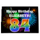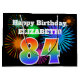 This fun, vibrant gift bag design features a colourful pattern inspired by celebratory fireworks, along with the number "84" having a multicolored rainbow like gradient pattern, on a black coloured background. It also features a personalised name and event message, such as a birthday greeting. A colourful gift bag like this might be used when wrapping a gift or present that is being given in celebration of somebody’s eighty fourth birthday. [~Z0000328]