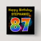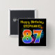 This fun, vibrant button design features a colourful bursting celebratory fireworks inspired pattern, along with the number "87" having a multicolored rainbow like spectrum or gradient pattern. It also features a customisable name and event message, such as a "Happy Birthday" birthday greeting. A button like this might be worn by the guests at a birthday party being held in celebration of somebody’s eighty seventh birthday. [~Z0000334]