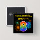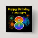 This fun, vibrant button design features a colourful pattern inspired by bursting celebratory fireworks, along with the number "8" featuring a multicolored rainbow inspired spectrum or gradient pattern. It also features a customisable name and event message, such as a "Happy Birthday" birthday greeting. A button like this might be worn by the guests at a birthday party being held to celebrate somebody’s eighth birthday. [~Z0000334]