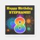 This fun, vibrant paper napkin design features a colourful pattern inspired by celebratory fireworks, along with the number "8" having a multicolored rainbow like gradient pattern, on a black coloured background. It also features a customisable name and event message. Paper napkins like this might be used at a party being held to celebrate somebody’s eighth birthday. [~Z0000326]
