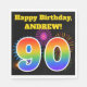 This fun, vibrant paper napkin design features a colourful pattern inspired by celebratory fireworks, along with the number "90" having a multicolored rainbow like gradient pattern, on a black coloured background. It also features a custom name and event message. Paper napkins like this might be used at a birthday party being held to celebrate somebody’s ninetieth birthday. [~Z0000326]