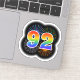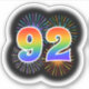 This fun, vibrant sticker design features a colourful bursting celebratory fireworks inspired pattern, along with the number "92" having a multicolored rainbow like spectrum or gradient pattern. An exciting sticker like this might be used when celebrating somebody’s ninety second birthday, or perhaps a couple’s ninety second wedding anniversary, or some other 92nd event. [~Z0000362]