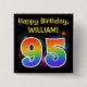 This fun, vibrant button design features a colourful pattern inspired by bursting celebratory fireworks, along with the number "95" having a multicolored rainbow inspired spectrum or gradient pattern. It also features a custom name and event message, such as a "Happy Birthday" birthday greeting. A button like this might be worn by the guests at a birthday party being held to celebrate somebody’s ninety fifth birthday. [~Z0000334]