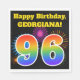 This fun, vibrant paper napkin design features a colourful celebratory fireworks inspired pattern, along with the number "96" having a multicolored rainbow like gradient pattern, on a black coloured background. It also features a personalised name and event message. Paper napkins like this could perhaps be used at a birthday party being held to celebrate somebody’s ninety sixth birthday. [~Z0000326]