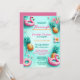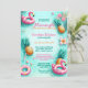 Pretty Flamingo and Pineapple birthday party invitation. The design has flamingo floaties and pineapple in a pool. The colours are teal aqua, pink and orange. Great for summer birthdays.