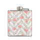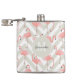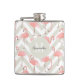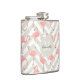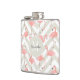 For a great gift idea for her, this custom flask features a pattern of ever-popular pink flamingos over a light grey and white chevron zig-zag stripes pattern. A matching round frame surrounds your desired monogram and name in style.