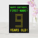 The front of this nerdy, editable birthday card design features the messages "HAPPY BIRTHDAY" and "9 YEARS OLD!", along with a customisable recipient name. The messages on the front have an appearance inspired by pixelated classic video games. The number "9" on the front is itself made up of smaller sized "9" digits, giving an ASCII art inspired look. The inside features a birthday greeting message that can be personalised. A geeky style, personalised birthday greeting card like this might be a special way to send birthday wishes to somebody celebrating their ninth birthday. [~Z0000366]