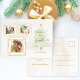 Fun and whimsical holiday greeting featuring three gold line drawn doodle square photo frames, watercolor Christmas tree with custom gold Peace on Earth calligraphy graphic on a watercolor background.