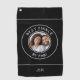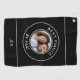 Creating your custom golf towel is a breeze with our user-friendly template. Simply upload your favourite photo and add any initials, name, or personalised message. You can even choose the text and background colours to match his preferences. The image and text are printed in white, accentuated by two circular white borders, providing a striking contrast against the solid black background.
