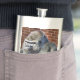 The product is a good size and came exactly as it was pictured.  The lid is not attached to the flask, which could be dangerous on drunken nights... The print came out surprisingly well and looks very sharp.  Would definitely recommend.