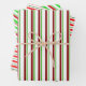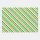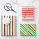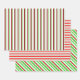 These fun, festive wrapping paper sheets designs feature Christmas style patterns of stripes having colours like green, white, and red. Festive wrapping paper sheets like these might be used when preparing gifts or presents being given when celebrating Christmas.