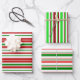 These wrapping paper sheets designs feature Christmas and holidays themed striped patterns having colours like green, white, and red. Wrapping paper sheets like this might be used when preparing gifts being given to celebrate Christmas.