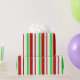 This Christmas style design features a red, white, and green coloured stripes pattern. Wrapping paper like this might be used when preparing presents being given to celebrate a birthday, a wedding, an anniversary, or some other event.