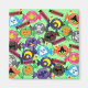 A pattern of Halloween candy, with different pictures on the wrappers that include a ghost, black cat, moon and stars, pumpkin, skull, witch, spider, bat. Also has candy corn and other candy in wrappers. Very fun for Halloween.