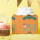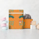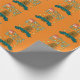 Adorable fun birthday wrapping paper to brighten up your party. Design starts from the top with Happy Birthday in green and yellow text with a cake with pink icing and three lit candles next ti the H in happy. Below the text is a cute funny happy brown potato with stick arms and a big smile. Across the potato is a blue banner with a template to add your name to personalise. Finally three yellow stars are dotted around the potato.