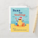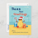 Fun Humorous Season Greetings Santa Claus Custom Holiday Postcard a fun card with the warm the sandy beach and Sand Snowman Santa Claus on it with presents and a candy cane. Personalize it with your names.